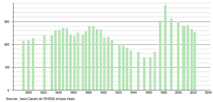 L'évolution du nombre d'habitants est connue à travers les recensements de la population effectués dans la commune depuis 1793. Pour les communes de moins de 10 000 habitants, une enquête de recensement portant sur toute la population est réalisée tous les cinq ans, les populations légales des années intermédiaires étant quant à elles estimées par interpolation ou extrapolation[26]. Pour la commune, le premier recensement exhaustif entrant dans le cadre du nouveau dispositif a été réalisé en 2007[27].