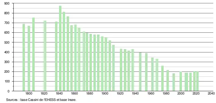 L'évolution du nombre d'habitants est connue à travers les recensements de la population effectués dans la commune depuis 1793. Pour les communes de moins de 10 000 habitants, une enquête de recensement portant sur toute la population est réalisée tous les cinq ans, les populations légales des années intermédiaires étant quant à elles estimées par interpolation ou extrapolation[19]. Pour la commune, le premier recensement exhaustif entrant dans le cadre du nouveau dispositif a été réalisé en 2007[20].