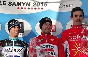 | Gianni Meersman ({{2e}}), Kris Boeckmans ({{1er}}) et Christophe Laporte ({{3e}}). | |||