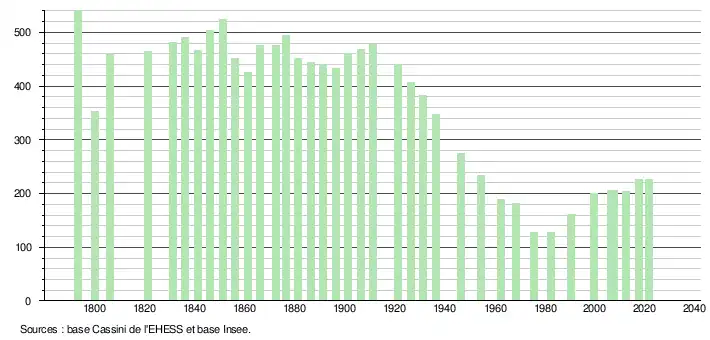 L'évolution du nombre d'habitants est connue à travers les recensements de la population effectués dans la commune depuis 1793. Pour les communes de moins de 10 000 habitants, une enquête de recensement portant sur toute la population est réalisée tous les cinq ans, les populations légales des années intermédiaires étant quant à elles estimées par interpolation ou extrapolation[23]. Pour la commune, le premier recensement exhaustif entrant dans le cadre du nouveau dispositif a été réalisé en 2007[24].