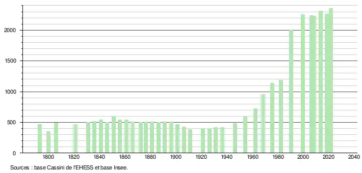 L'évolution du nombre d'habitants est connue à travers les recensements de la population effectués dans la commune depuis 1793. Pour les communes de moins de 10 000 habitants, une enquête de recensement portant sur toute la population est réalisée tous les cinq ans, les populations légales des années intermédiaires étant quant à elles estimées par interpolation ou extrapolation[20]. Pour la commune, le premier recensement exhaustif entrant dans le cadre du nouveau dispositif a été réalisé en 2008[21].