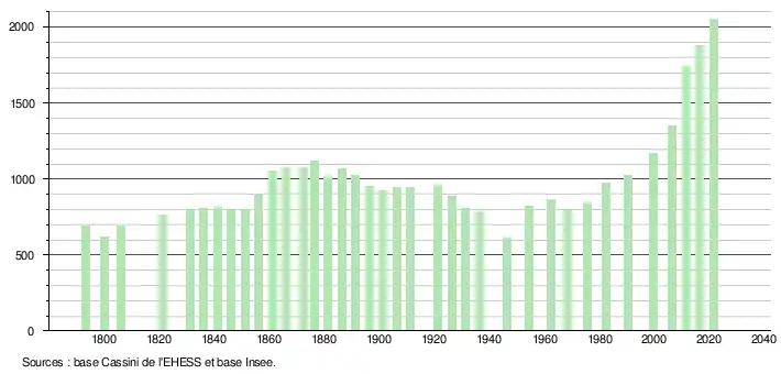 L'évolution du nombre d'habitants est connue à travers les recensements de la population effectués dans la commune depuis 1793. Pour les communes de moins de 10 000 habitants, une enquête de recensement portant sur toute la population est réalisée tous les cinq ans, les populations légales des années intermédiaires étant quant à elles estimées par interpolation ou extrapolation[19]. Pour la commune, le premier recensement exhaustif entrant dans le cadre du nouveau dispositif a été réalisé en 2006[20].