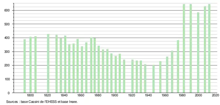 L'évolution du nombre d'habitants est connue à travers les recensements de la population effectués dans la commune depuis 1793. À partir du , les populations légales des communes sont publiées annuellement dans le cadre d'un recensement qui repose désormais sur une collecte d'information annuelle, concernant successivement tous les territoires communaux au cours d'une période de cinq ans. Pour les communes de moins de 10 000 habitants, une enquête de recensement portant sur toute la population est réalisée tous les cinq ans, les populations légales des années intermédiaires étant quant à elles estimées par interpolation ou extrapolation[4]. Pour la commune, le premier recensement exhaustif entrant dans le cadre du nouveau dispositif a été réalisé en 2007[5],[Note 1].