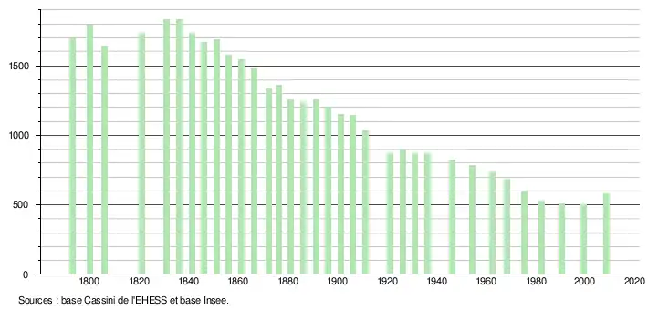 - Dans le tableau des recensements et le graphique, par convention dans Wikipédia, le principe a été retenu, pour les populations légales postérieures à 1999 de n’afficher dans le tableau des recensements et le graphique que les populations correspondant à l'année 2006, première population légale publiée calculée conformément aux concepts définis dans le décret no 2003-485 du 5 juin 2003, et les années correspondant à une enquête exhaustive de recensement pour les communes de moins de 10 000 habitants, ainsi que la dernière population légale publiée par l’Insee.