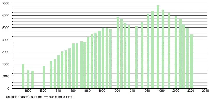 L'évolution du nombre d'habitants est connue à travers les recensements de la population effectués dans la commune depuis 1793. Pour les communes de moins de 10 000 habitants, une enquête de recensement portant sur toute la population est réalisée tous les cinq ans, les populations légales des années intermédiaires étant quant à elles estimées par interpolation ou extrapolation[40]. Pour la commune, le premier recensement exhaustif entrant dans le cadre du nouveau dispositif a été réalisé en 2005[41].
