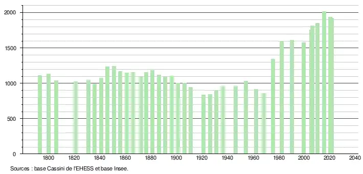 L'évolution du nombre d'habitants est connue à travers les recensements de la population effectués dans la commune depuis 1793. Pour les communes de moins de 10 000 habitants, une enquête de recensement portant sur toute la population est réalisée tous les cinq ans, les populations légales des années intermédiaires étant quant à elles estimées par interpolation ou extrapolation[28]. Pour la commune, le premier recensement exhaustif entrant dans le cadre du nouveau dispositif a été réalisé en 2005[29].