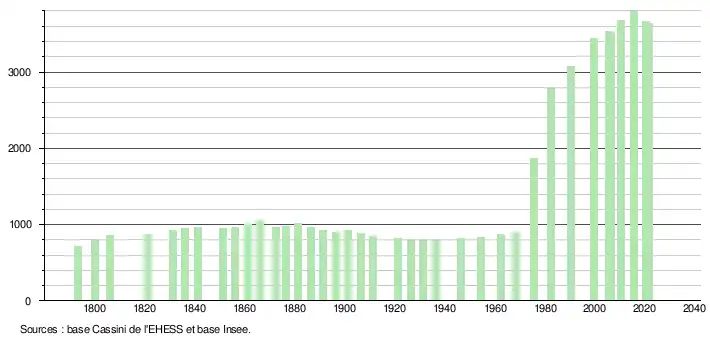 L'évolution du nombre d'habitants est connue à travers les recensements de la population effectués dans la commune depuis 1793. Pour les communes de moins de 10 000 habitants, une enquête de recensement portant sur toute la population est réalisée tous les cinq ans, les populations légales des années intermédiaires étant quant à elles estimées par interpolation ou extrapolation[24]. Pour la commune, le premier recensement exhaustif entrant dans le cadre du nouveau dispositif a été réalisé en 2005[25].