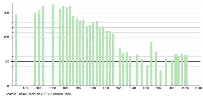 L'évolution du nombre d'habitants est connue à travers les recensements de la population effectués dans la commune depuis 1765. Pour les communes de moins de 10 000 habitants, une enquête de recensement portant sur toute la population est réalisée tous les cinq ans, les populations légales des années intermédiaires étant quant à elles estimées par interpolation ou extrapolation[46]. Pour la commune, le premier recensement exhaustif entrant dans le cadre du nouveau dispositif a été réalisé en 2004[47].