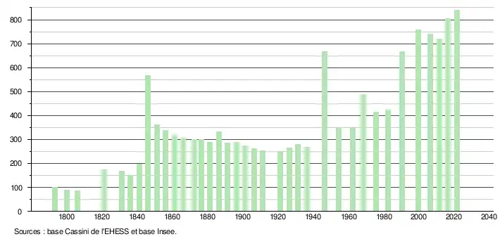 L'évolution du nombre d'habitants est connue à travers les recensements de la population effectués dans la commune depuis 1793. Pour les communes de moins de 10 000 habitants, une enquête de recensement portant sur toute la population est réalisée tous les cinq ans, les populations légales des années intermédiaires étant quant à elles estimées par interpolation ou extrapolation[21]. Pour la commune, le premier recensement exhaustif entrant dans le cadre du nouveau dispositif a été réalisé en 2006[22].