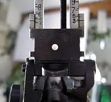 Le SMLE Mk V (qui devient le Rifle No 1 Mk V) reçoit un nouveau système de visée montée sur une platine qui déplace l’œilleton de son emplacement initial sur le canon vers la boite de culasse[30]. La distance ainsi gagnée permet un allongement de la ligne de mire qui favorise la précision de la visée. Dans la position repliée, une distance de combat fixe de 300 yards (270 m) permet de prendre la visée rapidement à toute distance. Une alternative développée pendant cette période et qui est utilisée sur la version No 4, un système de visée basculant en L plus sommaire permet de choisir deux hausses de combat de 300 ou 600 yards. Cette solution est bien moins onéreuse que le système de visée par hausse verticale.