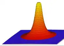 Dans toute la suite de l'article E désigne un espace euclidien et n sa dimension. La démonstration du lemme d'Urysohn en géométrie différentielle demande la construction de fonctions plateau, analogue à celle illustrée sur la figure de droite. On cherche une application fδ, où δ est un réel strictement positif, de E et à valeurs dans les nombres réels positifs, à support dans la boule fermée de centre le vecteur nul et de rayon δ, infiniment différentiable et d'intégrale sur E égale à 1[16].