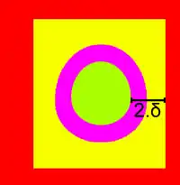 Considérons la fonction de K dans R+, qui à x associe la distance entre x et cΩ. C'est une fonction continue, définie sur un compact, elle atteint sa borne inférieure. Si cette borne inférieure était nulle, elle serait atteinte en un point x adhérent à K et à cΩ. Comme ces deux ensembles sont fermés, x serait élément de K et de cΩ. Par définition de Ω, un tel point ne peut exister et la borne inférieure est strictement positive. Soit δ un réel strictement positif tel que 2.δ soit plus petit que cette borne inférieure (illustré sur la figure de gauche). On considère alors l'ensemble V, illustré en violet sur la figure de gauche, des points de E situés à une distance inférieure ou égale à δ de K. Par construction, tout point de cΩ est à une distance au moins égale à δ de V et toute boule de centre un point de K et de rayon δ est incluse dans l'ensemble V.