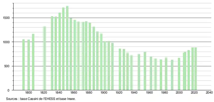 L'évolution du nombre d'habitants est connue à travers les recensements de la population effectués dans la commune depuis 1793. Pour les communes de moins de 10 000 habitants, une enquête de recensement portant sur toute la population est réalisée tous les cinq ans, les populations légales des années intermédiaires étant quant à elles estimées par interpolation ou extrapolation[20]. Pour la commune, le premier recensement exhaustif entrant dans le cadre du nouveau dispositif a été réalisé en 2007[21].