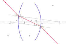 Dans les conditions de Gauss, une lentille épaisse sphérique peut être modélisée par un système centré de points principaux objet et image . Compte tenu du fait que la lentille est plongée dans un seul et même milieu, les points nodaux objet et image sont confondus avec les points principaux respectivement et .