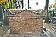 Le , Euler décède à Saint-Pétersbourg d'une hémorragie intra-cérébrale[24] et est enterré auprès de son épouse Katharina au cimetière luthérien de Smolensk, sur l'île Vassilievski (au XXe siècle le cimetière a été fermé, les restes d'Euler ont été transférés au cimetière Saint-Lazare du monastère Alexandre-Nevski). Son éloge funèbre est écrit pour l'Académie française par le mathématicien et philosophe français Nicolas de Condorcet. Le récit de sa vie, avec une liste de ses œuvres, sera écrit par Nikolaus von Fuss, son secrétaire permanent à l'Académie des sciences de Russie, qui avait épousé en 1784 une de ses petites-filles. Condorcet écrit dans son Éloge : « il cessa de calculer et de vivre[28] ».