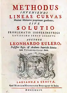 - Methodus inveniendi lineas curvas maximi minimive proprietate gaudentes, sive solutio problematis isoperimetrici latissimo sensu accepti, 1744 ; le titre latin se traduit par « Une méthode pour trouver des lignes courbes jouissant de propriétés de maximum ou de minimum, ou la solution de problèmes isopérimétrique dans le sens le plus large ».