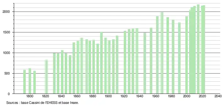 L'évolution du nombre d'habitants est connue à travers les recensements de la population effectués dans la commune depuis 1793. Pour les communes de moins de 10 000 habitants, une enquête de recensement portant sur toute la population est réalisée tous les cinq ans, les populations légales des années intermédiaires étant quant à elles estimées par interpolation ou extrapolation[27]. Pour la commune, le premier recensement exhaustif entrant dans le cadre du nouveau dispositif a été réalisé en 2004[28].