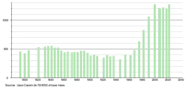 L'évolution du nombre d'habitants est connue à travers les recensements de la population effectués dans la commune depuis 1793. Pour les communes de moins de 10 000 habitants, une enquête de recensement portant sur toute la population est réalisée tous les cinq ans, les populations légales des années intermédiaires étant quant à elles estimées par interpolation ou extrapolation[25]. Pour la commune, le premier recensement exhaustif entrant dans le cadre du nouveau dispositif a été réalisé en 2007[26].