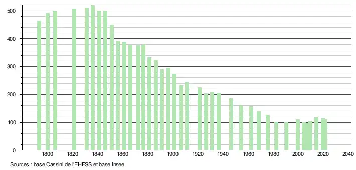 L'évolution du nombre d'habitants est connue à travers les recensements de la population effectués dans la commune depuis 1793. Pour les communes de moins de 10 000 habitants, une enquête de recensement portant sur toute la population est réalisée tous les cinq ans, les populations légales des années intermédiaires étant quant à elles estimées par interpolation ou extrapolation[20]. Pour la commune, le premier recensement exhaustif entrant dans le cadre du nouveau dispositif a été réalisé en 2004[21].