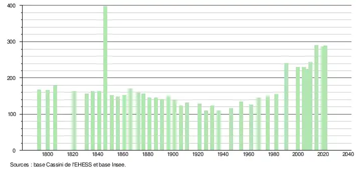 L'évolution du nombre d'habitants est connue à travers les recensements de la population effectués dans la commune depuis 1793. Pour les communes de moins de 10 000 habitants, une enquête de recensement portant sur toute la population est réalisée tous les cinq ans, les populations légales des années intermédiaires étant quant à elles estimées par interpolation ou extrapolation[19]. Pour la commune, le premier recensement exhaustif entrant dans le cadre du nouveau dispositif a été réalisé en 2004[20].