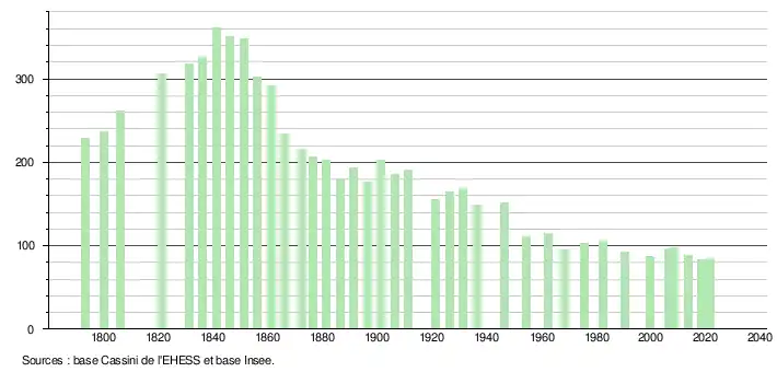 L'évolution du nombre d'habitants est connue à travers les recensements de la population effectués dans la commune depuis 1793. Pour les communes de moins de 10 000 habitants, une enquête de recensement portant sur toute la population est réalisée tous les cinq ans, les populations légales des années intermédiaires étant quant à elles estimées par interpolation ou extrapolation[18]. Pour la commune, le premier recensement exhaustif entrant dans le cadre du nouveau dispositif a été réalisé en 2008[19].