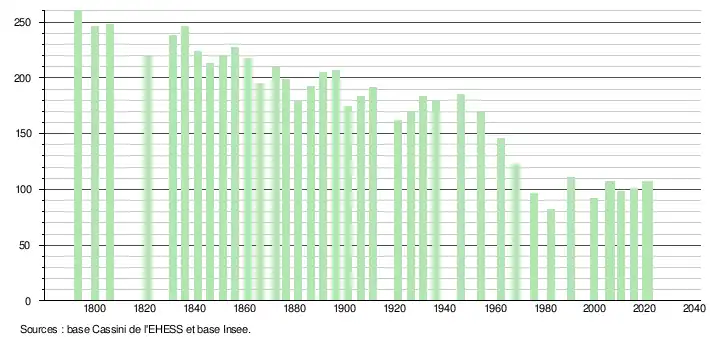 L'évolution du nombre d'habitants est connue à travers les recensements de la population effectués dans la commune depuis 1793. Pour les communes de moins de 10 000 habitants, une enquête de recensement portant sur toute la population est réalisée tous les cinq ans, les populations légales des années intermédiaires étant quant à elles estimées par interpolation ou extrapolation[25]. Pour la commune, le premier recensement exhaustif entrant dans le cadre du nouveau dispositif a été réalisé en 2005[26].
