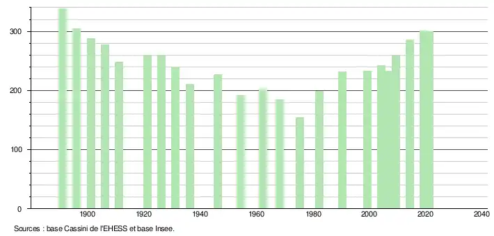 L'évolution du nombre d'habitants est connue à travers les recensements de la population effectués dans la commune depuis 1891. Pour les communes de moins de 10 000 habitants, une enquête de recensement portant sur toute la population est réalisée tous les cinq ans, les populations légales des années intermédiaires étant quant à elles estimées par interpolation ou extrapolation[23]. Pour la commune, le premier recensement exhaustif entrant dans le cadre du nouveau dispositif a été réalisé en 2004[24].