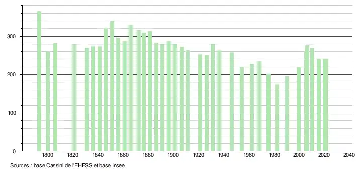 L'évolution du nombre d'habitants est connue à travers les recensements de la population effectués dans la commune depuis 1793. Pour les communes de moins de 10 000 habitants, une enquête de recensement portant sur toute la population est réalisée tous les cinq ans, les populations légales des années intermédiaires étant quant à elles estimées par interpolation ou extrapolation[22]. Pour la commune, le premier recensement exhaustif entrant dans le cadre du nouveau dispositif a été réalisé en 2005[23].