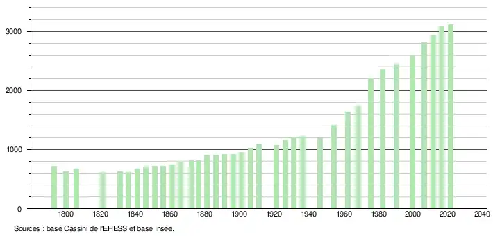 L'évolution du nombre d'habitants est connue à travers les recensements de la population effectués dans la commune depuis 1793. Pour les communes de moins de 10 000 habitants, une enquête de recensement portant sur toute la population est réalisée tous les cinq ans, les populations légales des années intermédiaires étant quant à elles estimées par interpolation ou extrapolation[20]. Pour la commune, le premier recensement exhaustif entrant dans le cadre du nouveau dispositif a été réalisé en 2006[21].
