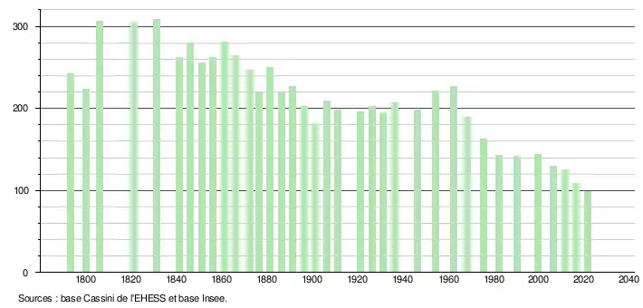 L'évolution du nombre d'habitants est connue à travers les recensements de la population effectués dans la commune depuis 1793. Pour les communes de moins de 10 000 habitants, une enquête de recensement portant sur toute la population est réalisée tous les cinq ans, les populations légales des années intermédiaires étant quant à elles estimées par interpolation ou extrapolation[30]. Pour la commune, le premier recensement exhaustif entrant dans le cadre du nouveau dispositif a été réalisé en 2006[31].