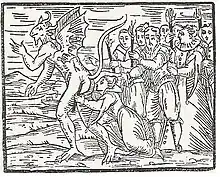 "Baiser obscène de sorcières sur l'anus du diable", gravure sur bois du Compendium Maleficarum, dessiné par Francesco Maria Guazzo en 1608 - Le lendemain du rêve, alors que Jeremiah Steiner et Hermann Hesse partent pour leur congrès d'alchimie à Sion, Corto prend la route pour Zurich avec la célèbre artiste Art Déco polonaise Tamara de Lempicka[alpha 3].