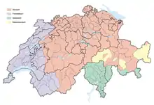 Carte des régions linguistiques en Suisse - Le canton des Grisons (GR) est le plus grand de Suisse, mesurant 7 115 km2, soit 1/6 de la superficie du pays. Il s’échelonne en altitude entre les moins de 300 m du Val Mesolcina et les 4 048,6 m du Piz Bernina (point culminant des Alpes orientales centrales). Cette vaste étendue montagnarde peut être considérée tel que le "château d'eau de l'Europe"[alpha 13]. Le Rhin y prend sa source, par le Rhin antérieur (provenant du Lac de Toma) et le Rhin Postérieur (du Rheinwaldhorn). Plusieurs ruisseaux du canton alimentent différents cours d'eau européen, traversant notamment l'Engadine et rejoignant (via l'Inn) le Danube, ou bien le Pô et l'Adige. Ses cours d'eau aboutissent tantôt dans la mer Adriatique, la mer du Nord ou encore, la mer Noire. Le canton est aussi le seul à être officiellement trilingue et à parler le romanche (en plus de l’italien et surtout de l'allemand). Enfin, on peut y découvrir le Château d'Ortenstein (de), ainsi que le village de Scuol.