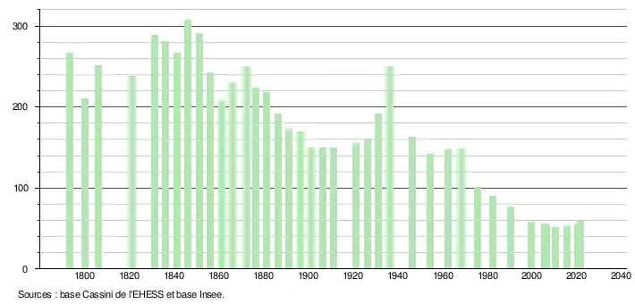 L'évolution du nombre d'habitants est connue à travers les recensements de la population effectués dans la commune depuis 1793. Pour les communes de moins de 10 000 habitants, une enquête de recensement portant sur toute la population est réalisée tous les cinq ans, les populations légales des années intermédiaires étant quant à elles estimées par interpolation ou extrapolation[24]. Pour la commune, le premier recensement exhaustif entrant dans le cadre du nouveau dispositif a été réalisé en 2005[25].