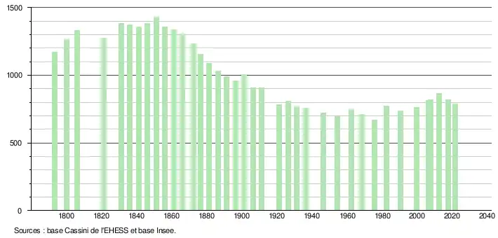 L'évolution du nombre d'habitants est connue à travers les recensements de la population effectués dans la commune depuis 1793. Pour les communes de moins de 10 000 habitants, une enquête de recensement portant sur toute la population est réalisée tous les cinq ans, les populations légales des années intermédiaires étant quant à elles estimées par interpolation ou extrapolation[24]. Pour la commune, le premier recensement exhaustif entrant dans le cadre du nouveau dispositif a été réalisé en 2007[25].