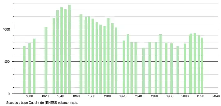 L'évolution du nombre d'habitants est connue à travers les recensements de la population effectués dans la commune depuis 1793. Pour les communes de moins de 10 000 habitants, une enquête de recensement portant sur toute la population est réalisée tous les cinq ans, les populations légales des années intermédiaires étant quant à elles estimées par interpolation ou extrapolation[45]. Pour la commune, le premier recensement exhaustif entrant dans le cadre du nouveau dispositif a été réalisé en 2007[46].