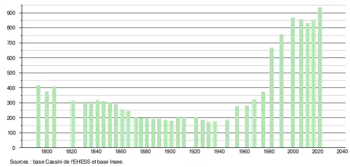 L'évolution du nombre d'habitants est connue à travers les recensements de la population effectués dans la commune depuis 1793. Pour les communes de moins de 10 000 habitants, une enquête de recensement portant sur toute la population est réalisée tous les cinq ans, les populations légales des années intermédiaires étant quant à elles estimées par interpolation ou extrapolation[17]. Pour la commune, le premier recensement exhaustif entrant dans le cadre du nouveau dispositif a été réalisé en 2006[18].