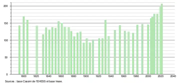 L'évolution du nombre d'habitants est connue à travers les recensements de la population effectués dans la commune depuis 1793. Pour les communes de moins de 10 000 habitants, une enquête de recensement portant sur toute la population est réalisée tous les cinq ans, les populations légales des années intermédiaires étant quant à elles estimées par interpolation ou extrapolation[18]. Pour la commune, le premier recensement exhaustif entrant dans le cadre du nouveau dispositif a été réalisé en 2004[19].