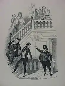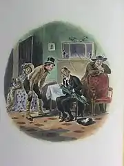 Le nouvel illustrateur est Robert W. Buss (1804-1875)[21], mais, le travail qu'il réalise pour le troisième numéro n'étant pas jugé à la hauteur, il est sommairement remercié[N 3],[22]. C'est le jeune Hablot Knight Browne (1815-1882), âgé de vingt ans, qui le remplace, au détriment de Thackeray[N 4],[23] qui s'était porté candidat[10]. Il inaugure ainsi une collaboration de vingt-trois ans avec Dickens[24], et, pour l'occasion, afin de rester dans la veine du nom de plume de son employeur « Boz », il adopte, en accord avec Dickens, le pseudonyme qui le rendra célèbre, « Phiz »[10], abréviation argotique de physiognomy (physionomie, visage)[N 5],[25], mot très à la mode en cette première partie du XIXe siècle[N 6]. Browne jouit déjà d'une certaine renommée, car il vient d'être récompensé pour son estampe du John Gilpin de William Cowper (1731-1800) où un cavalier à la mine déconfite perché sur un cheval mors aux dents annonce bien des plans du futur Pickwick auquel il va collaborer[15],[26].