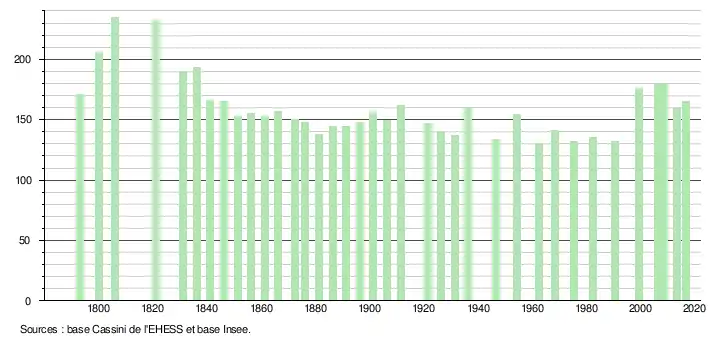 L'évolution du nombre d'habitants est connue à travers les recensements de la population effectués dans la commune depuis 1793. Pour les communes de moins de 10 000 habitants, une enquête de recensement portant sur toute la population est réalisée tous les cinq ans, les populations légales des années intermédiaires étant quant à elles estimées par interpolation ou extrapolation[2]. Pour la commune, le premier recensement exhaustif entrant dans le cadre du nouveau dispositif a été réalisé en 2008[3].