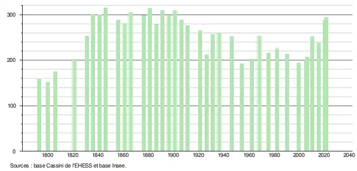 L'évolution du nombre d'habitants est connue à travers les recensements de la population effectués dans la commune depuis 1793. Pour les communes de moins de 10 000 habitants, une enquête de recensement portant sur toute la population est réalisée tous les cinq ans, les populations légales des années intermédiaires étant quant à elles estimées par interpolation ou extrapolation[19]. Pour la commune, le premier recensement exhaustif entrant dans le cadre du nouveau dispositif a été réalisé en 2005[20].