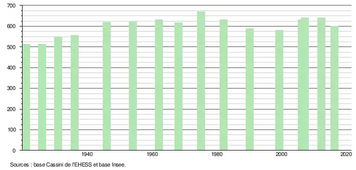 L'évolution du nombre d'habitants est connue à travers les recensements de la population effectués dans la commune depuis 1921. Pour les communes de moins de 10 000 habitants, une enquête de recensement portant sur toute la population est réalisée tous les cinq ans, les populations légales des années intermédiaires étant quant à elles estimées par interpolation ou extrapolation[8]. Pour la commune, le premier recensement exhaustif entrant dans le cadre du nouveau dispositif a été réalisé en 2007[9].