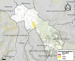 Le retrait-gonflement des sols argileux est susceptible d'engendrer des dommages importants aux bâtiments en cas d’alternance de périodes de sécheresse et de pluie. 1,4 % de la superficie communale est en aléa moyen ou fort (15,8 % au niveau départemental et 48,5 % au niveau national). Sur les 111 bâtiments dénombrés sur la commune en 2019, 2 sont en aléa moyen ou fort, soit 2 %, à comparer aux 14 % au niveau départemental et 54 % au niveau national. Une cartographie de l'exposition du territoire national au retrait gonflement des sols argileux est disponible sur le site du BRGM[36],[Carte 2].