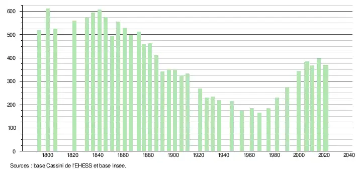 L'évolution du nombre d'habitants est connue à travers les recensements de la population effectués dans la commune depuis 1793. Pour les communes de moins de 10 000 habitants, une enquête de recensement portant sur toute la population est réalisée tous les cinq ans, les populations légales des années intermédiaires étant quant à elles estimées par interpolation ou extrapolation[41]. Pour la commune, le premier recensement exhaustif entrant dans le cadre du nouveau dispositif a été réalisé en 2005[42].