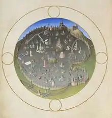 Les constructions de l'arrière-plan ont donné lieu à des interprétations divergentes. Selon Edmond Morand[43], il s'agirait du palais ducal de Riom, propriété du duc de Berry qui le fit reconstruire. Cependant, la disposition des bâtiments a été modifiée. Selon Saint-Jean Bourdin, il s'agirait de l'entrée à Riom de Bernard d'Armagnac remettant sa fille, Bonne, à son fiancé Charles d'Orléans, en présence du duc de Berry, avant le mariage qui eut lieu en . Selon Papertiant[44], il s'agirait plutôt du palais de la Cité à Paris avec le Châtelet à gauche, la Conciergerie et la tour de l'Horloge. Cette vue rappellerait alors le lieu du mariage de Jean de Bourbon et de Marie de Berry. En 1410, Jean de Bourbon venait d'accéder à la couronne ducale[c 17].