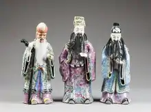 C'est à partir de la Dynastie Ming (明朝), c'est-à-dire entre le XIVe et le XVIIe siècle (1368-1644 après J.-C.) que vint l'idée de représenter les divinités de la Bonne Fortune ou du Bonheur sous forme humaine. Pour cela, on choisit parmi le panthéon déjà existant, trois Esprits/Dieux qui représenteraient le mieux cette fonction ; ce furent celui des « Émoluments ou Salaires », celui de « la Richesse » et celui de la « Longévité ». Tous trois devaient devenir inséparables à l'avenir pour apporter tout le bonheur au peuple.