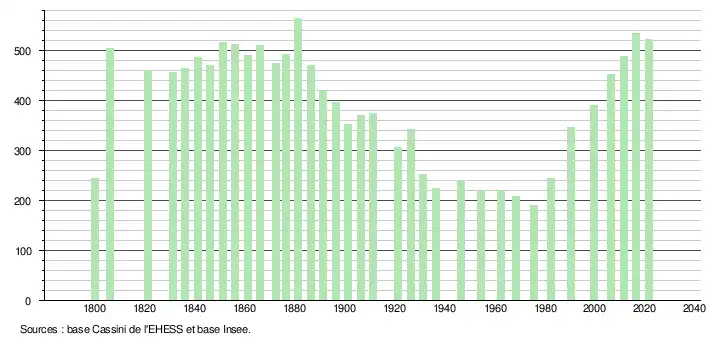L'évolution du nombre d'habitants est connue à travers les recensements de la population effectués dans la commune depuis 1800. Pour les communes de moins de 10 000 habitants, une enquête de recensement portant sur toute la population est réalisée tous les cinq ans, les populations légales des années intermédiaires étant quant à elles estimées par interpolation ou extrapolation[19]. Pour la commune, le premier recensement exhaustif entrant dans le cadre du nouveau dispositif a été réalisé en 2006[20].