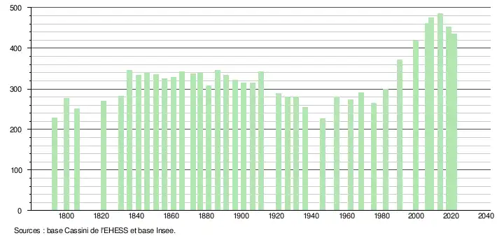 L'évolution du nombre d'habitants est connue à travers les recensements de la population effectués dans la commune depuis 1793. Pour les communes de moins de 10 000 habitants, une enquête de recensement portant sur toute la population est réalisée tous les cinq ans, les populations légales des années intermédiaires étant quant à elles estimées par interpolation ou extrapolation[52]. Pour la commune, le premier recensement exhaustif entrant dans le cadre du nouveau dispositif a été réalisé en 2008[53].