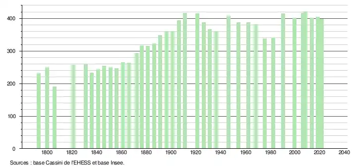L'évolution du nombre d'habitants est connue à travers les recensements de la population effectués dans la commune depuis 1793. Pour les communes de moins de 10 000 habitants, une enquête de recensement portant sur toute la population est réalisée tous les cinq ans, les populations légales des années intermédiaires étant quant à elles estimées par interpolation ou extrapolation[24]. Pour la commune, le premier recensement exhaustif entrant dans le cadre du nouveau dispositif a été réalisé en 2008[25].