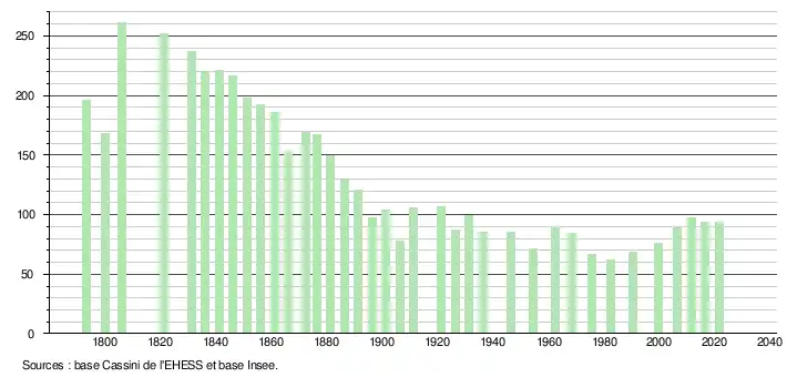 L'évolution du nombre d'habitants est connue à travers les recensements de la population effectués dans la commune depuis 1793. Pour les communes de moins de 10 000 habitants, une enquête de recensement portant sur toute la population est réalisée tous les cinq ans, les populations légales des années intermédiaires étant quant à elles estimées par interpolation ou extrapolation[21]. Pour la commune, le premier recensement exhaustif entrant dans le cadre du nouveau dispositif a été réalisé en 2006[22].