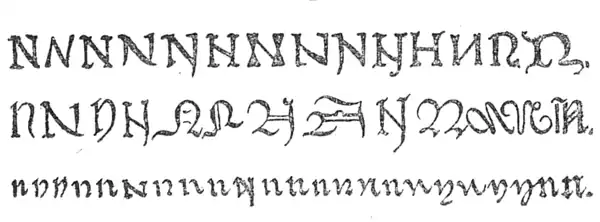 Formes majuscules et minuscules manuscrites de la lettre N dans le Dictionnaire des abréviations latines et française d’Alphonse Chassant.
